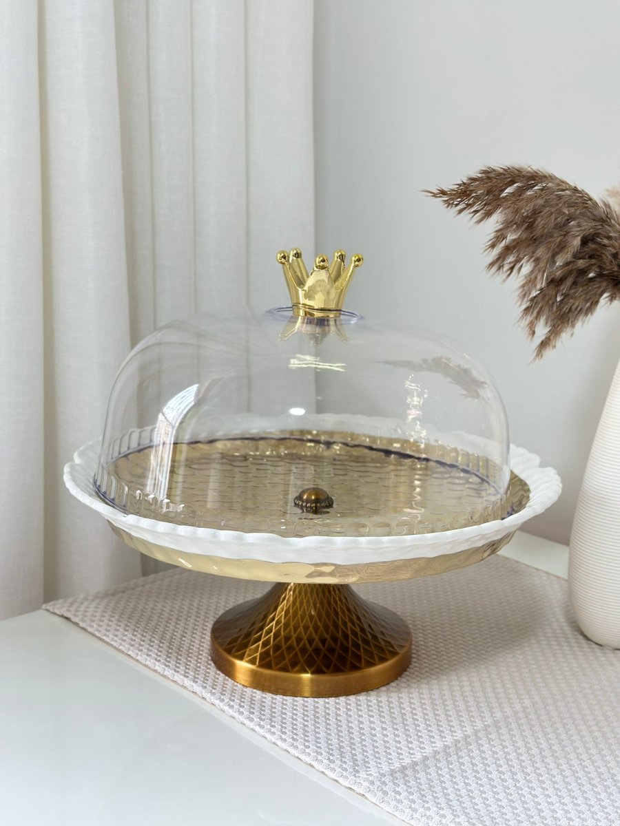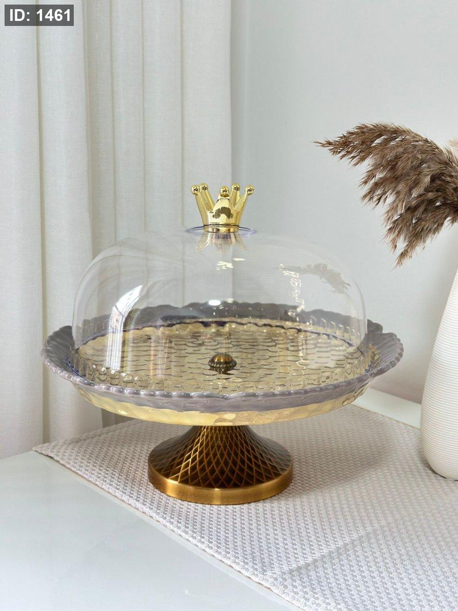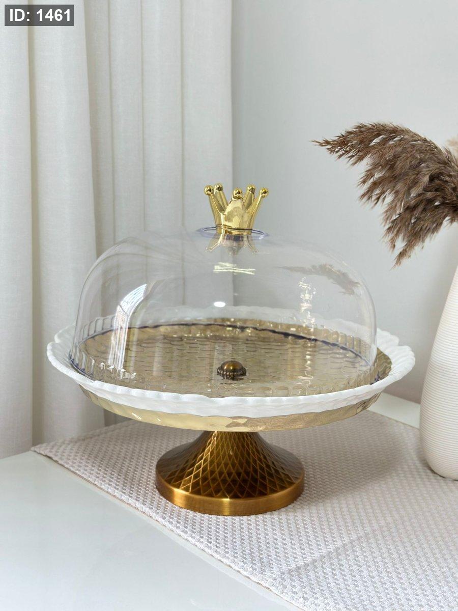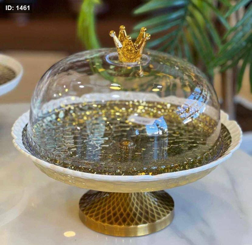 جاط كعك بورسلان ملون مذهب مع غطا برجل معدن انتيكا