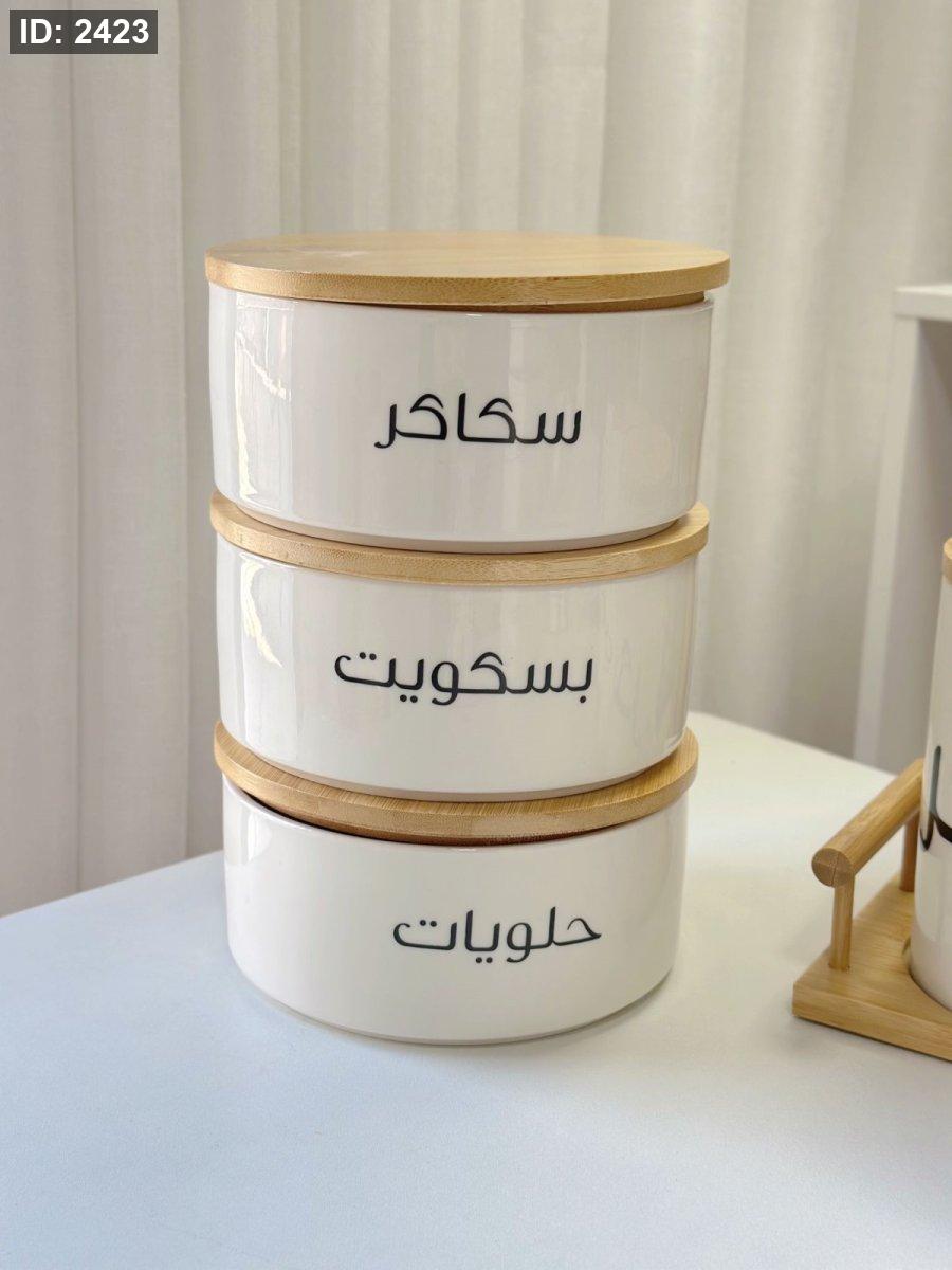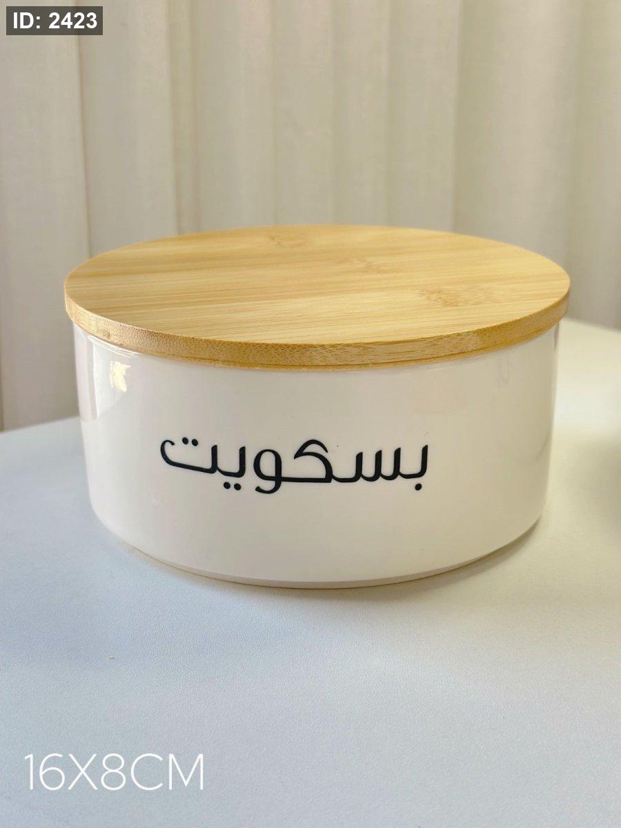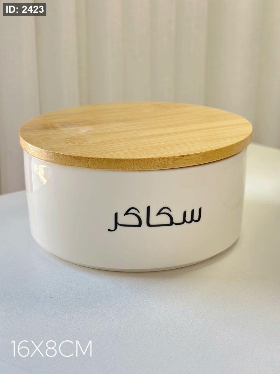 مرتبان بورسلان مدور غطاء بامبو كتابه