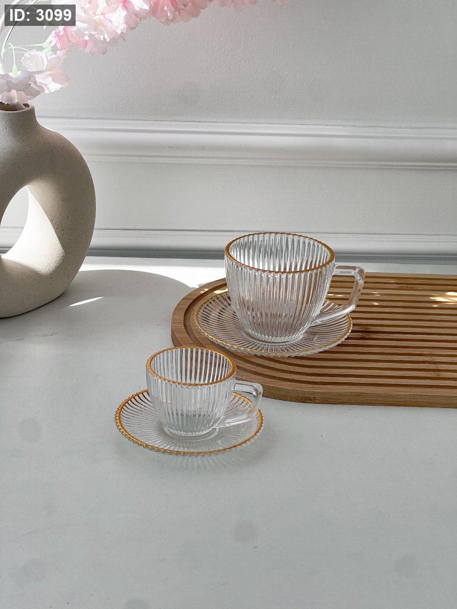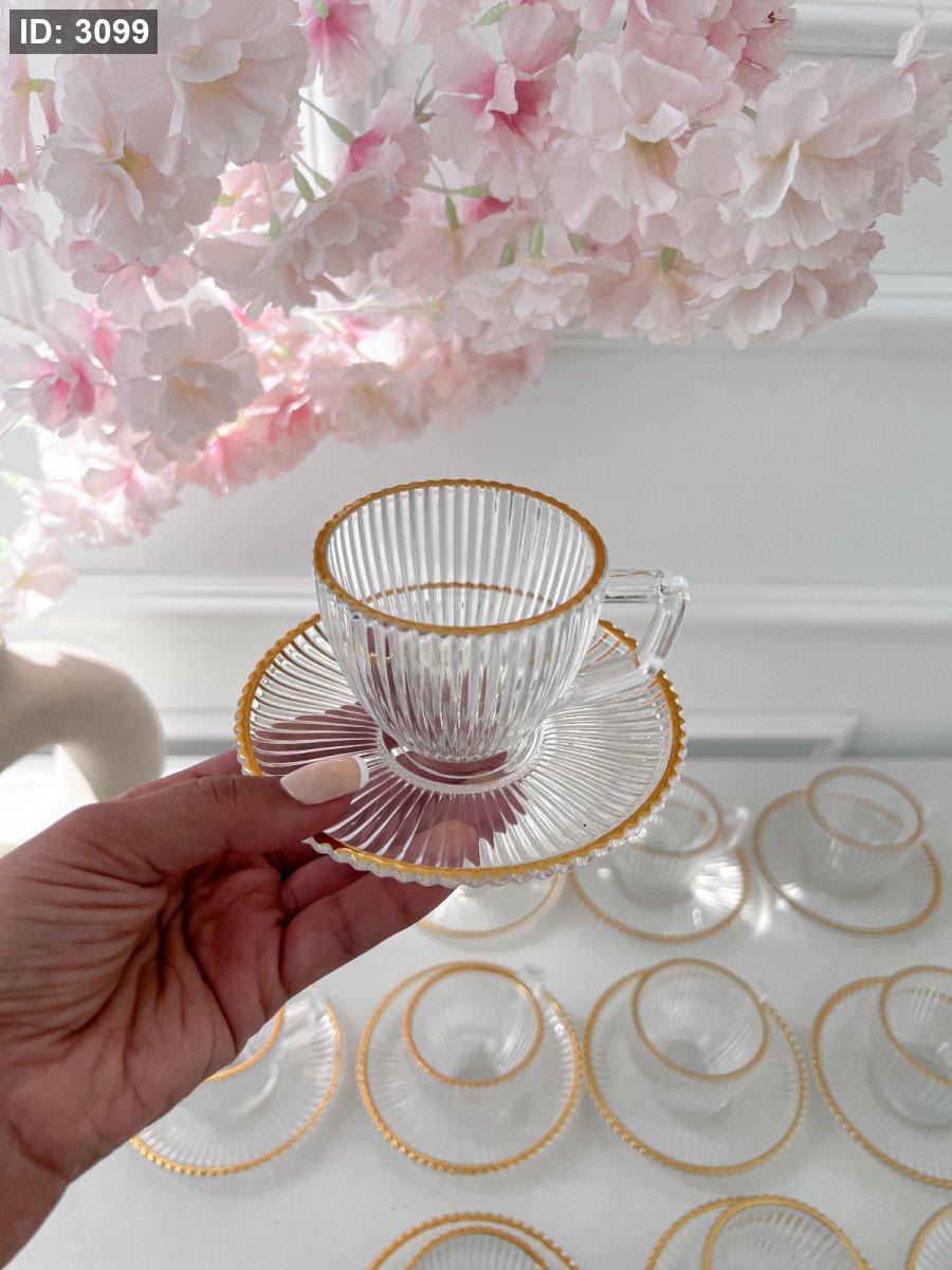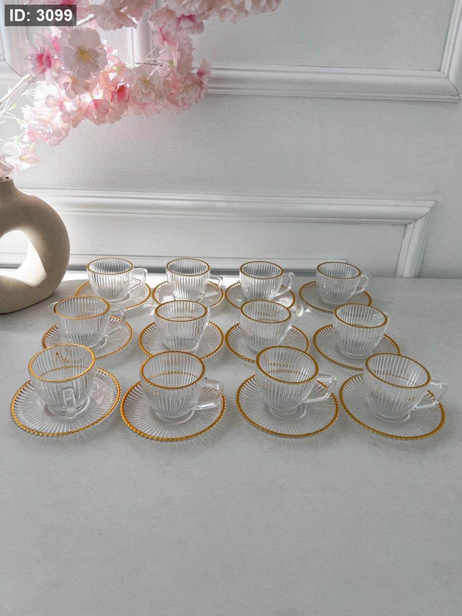 طقم12+12فناجين قهوه زجاج محزز حز مذهب