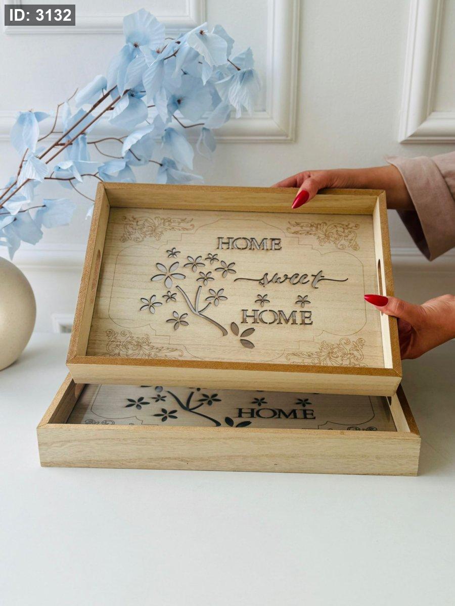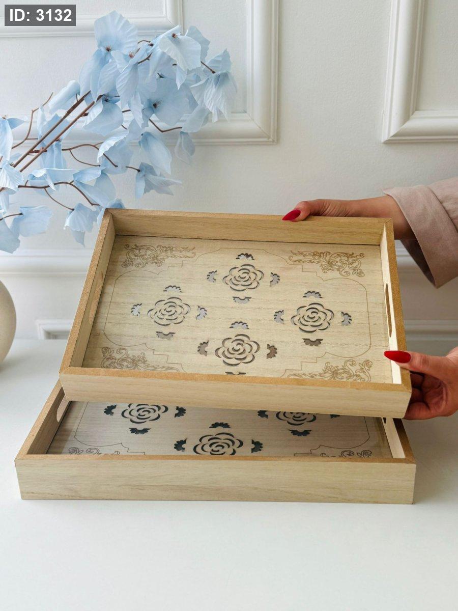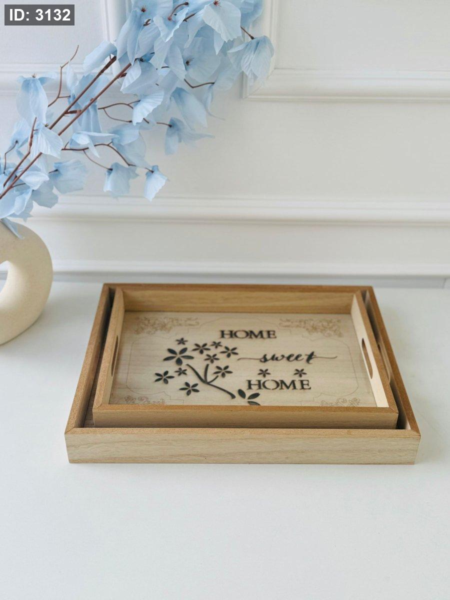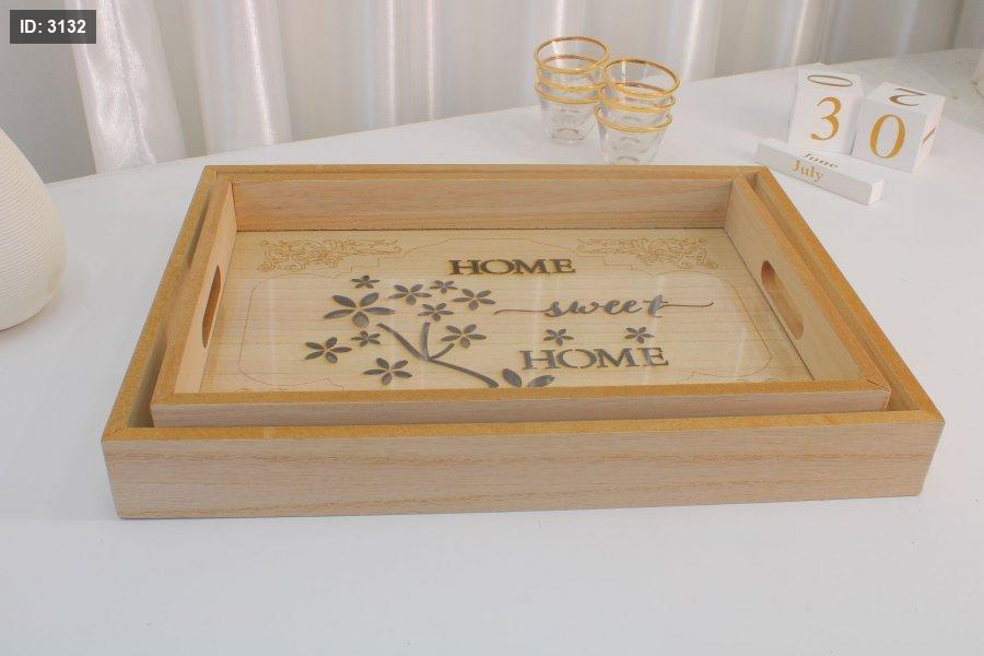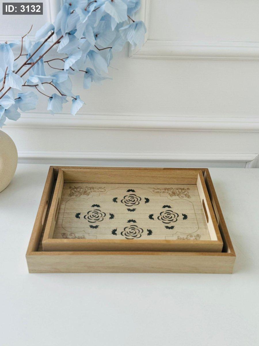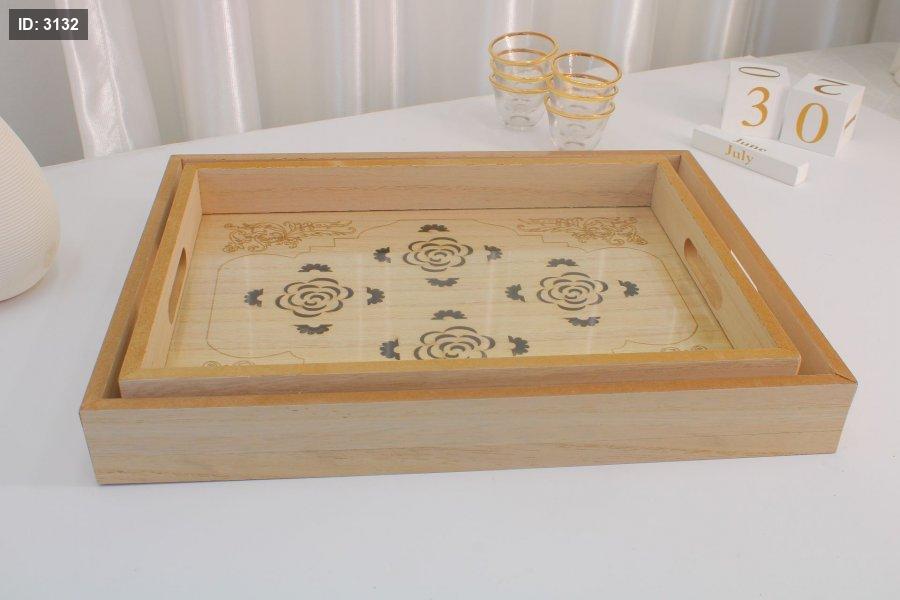 طقم صواني مستطيل 2 قطعه خشب+زجاج